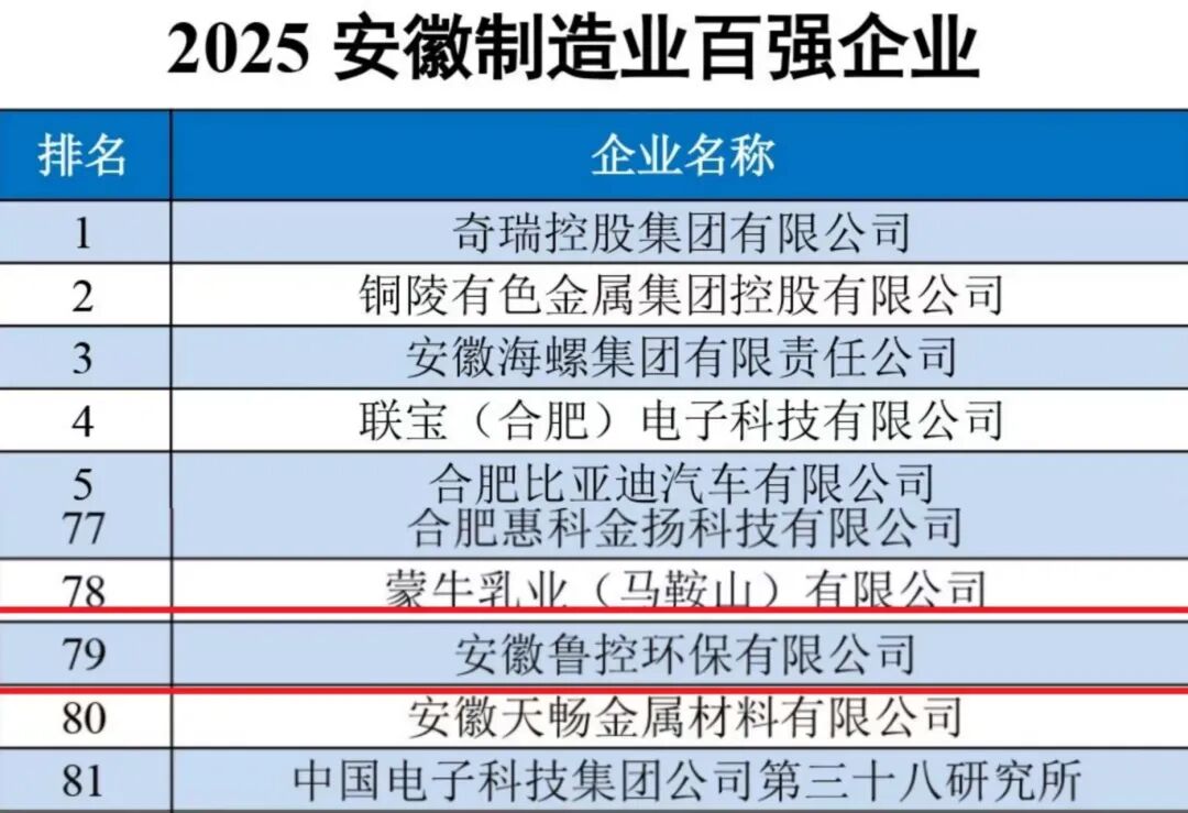近日,“2025年安徽制造業(yè)百強(qiáng)企業(yè)”榜單正式揭曉,山東環(huán)保集團(tuán)權(quán)屬安徽魯控環(huán)保有限公司連續(xù)三年榜上有名。